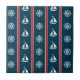 Design náutica com barco à vela e decoração de bússolas em fundo listrado vermelho, azul e branco