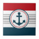 Design náutico com decoração em forma redonda com âncora sobre fundo azul, vermelho, cinza e branco listrado