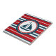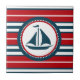 Design náutica com decoração em forma redonda de embarcações à vela, em fundo listrado vermelho, azul e branco