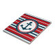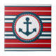 Design náutico com decoração em forma redonda com âncora sobre fundo listrado vermelho, azul e branco