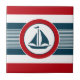 Design náutica com decoração em forma redonda de embarcações à vela, em fundo listrado, a azul, vermelho e branco