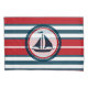 Design náutica com decoração em forma redonda de embarcações à vela, em fundo listrado vermelho, azul e branco