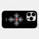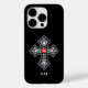 Imagem de uma cruz de diamante branco com um sotaque de pedra vermelha sobre um fundo preto. Monograma personalizado em branco.