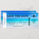 Uma imagem tropical à beira-mar é o fundo para este Passagem Aérea Destino casamento Save the Date. Um divertido design de casamento personalizado de destino. Praia tropical com azuis aquáticos e texto moderno.