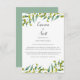 Um cartão de informações do convidado de casamento de jardim rural elegante, apresentando folhas frescas naturais de eucalipto, folhagem verde, enquadrando os detalhes do seu casamento em letra cursiva elegante e tipografia clássica. Projetado por Thisisnotme©