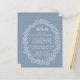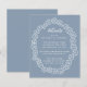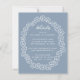 Um cartão de detalhes de casamento com o texto incluído numa moldura floral grosseiramente oval, uma coroa de flores. Os detalhes do título são escritos em letra cursiva, o resto em maiúsculas. O texto e a moldura floral são brancos, o fundo é azul empoeirado.