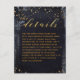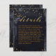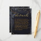 Um cartão de detalhes de convite de casamento preto e dourado usado para transmitir informações adicionais aos seus convidados, apresenta uma aquarela preta com respingos de tinta dourada, reminiscente de um céu noturno em meio a estrelas douradas brilhantes. Uma caligrafia clássica em script inglês dourado para seus nomes com letras pequenas em bloco para os detalhes.