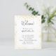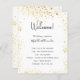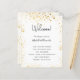 Um programa de casamento moderno e elegante, linha do tempo. Um fundo branco decorado com poeira falsa dourada. Personalize e adicione seus nomes e detalhes do casamento. Letras pretas coloridas. Se você tiver mais texto, é possível reduzir o espaço na linha.