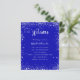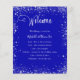 Um programa de casamento moderno e elegante, linha do tempo. Um fundo azul real, decorado com pó falso prateado. Personalize e adicione seus nomes e detalhes do casamento. Letras brancas coloridas. Se você tiver mais texto, é possível reduzir o espaço na linha.