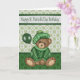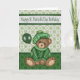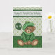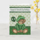 Deseje a alguém em geral uma Rua Feliz. Aniversário do Dia de Patrick com um cartão com um urso bonito vestindo um suéter e um chapéu segurando um balão num verde com fundo de vergonha. Design por Laurie Schneider/Elements by Digital Designs por Elena/Diana'z Designz