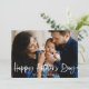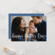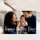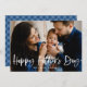 Cartão de dia de os pais bonito e moderno com sua foto favorita da família com "Dia de os pais Feliz" em uma camada branca de script de pincel, escrita à mão. Personalize a frente da placa de dia de os pais adicionando uma saudação personalizada e seus nomes. A placa se reverte para um padrão de xadrez azul e branco.