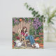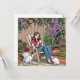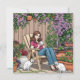 Uma bela ilustração do ai feita em um estilo de desenho animado de uma senhora bebendo café no seu pátio fora com seus dois gatos brancos. Ela está rodeada por belas cercas de Clematis roxa e outras plantas bonito.