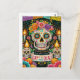 Convide seus convidados para uma comemoração vibrante do Dia dos Mortos com este cartão postal colorido com crânios tradicionais de açúcar, flores brilhantes e decorações festivas. Perfeito para dar o tom a uma festa memorável!