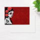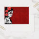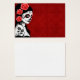 Este Dia dos Mortos inspirou uma design com uma bela mulher com padrões de crânio de açúcar no rosto. Três rosas aparecem em seu cabelo preto a jato com mais dois rosas tatuados em seu braço. A garota está de lado com a cabeça virada levemente para o espectador. Sua pele branca pura realmente se destaca contra o cabelo preto e o vestido assim como o fundo vermelho ligeiramente texturizado. Esta design única é uma representação impressionante deste Dia da Mulher Morta.