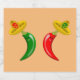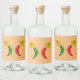 Esta maravilhosa folha de rótulos de garrafas de licor apresenta um par de pimenta, um chili vermelho e um chili verde. Ambos têm olhos pretos e bocas cor-de-rosa. Cada Chili está vestindo um chapéu sombrio que tem um crânio de cor oposta ao dos chili em comemoração ao Dia Mexicano do Festival dos Mortos, Dia De Los Muertos. O sombrero também contém três flores com pétalas vermelhas e verdes alternadas representando a bandeira do México.
