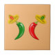 Este azulejo incrível apresenta um par de pimenta, um chili vermelho e um chili verde. Ambos têm olhos pretos e bocas cor-de-rosa. Cada Chili está vestindo um chapéu sombrio que tem um crânio de cor oposta ao dos chili em comemoração ao Dia Mexicano do Festival dos Mortos, Dia De Los Muertos. O sombrero também contém três flores com pétalas vermelhas e verdes alternadas representando a bandeira do México.