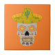 Este incrível azulejo apresenta uma imagem gráfica de um design de um Dia Mexicano dos Mortos (Dia de los Muertos) inspirado no crânio. O crânio é uma cinza pálida e está vestindo um sombrero amarelo. Ela tem dentes de ouro e girassóis mexicanos, também chamados de titonias em vez de olhos. O sombrero tem um cacto e está coberto por padrões de espiral bonito e pimentões-do-sul e vermelhos. O próprio crânio está coberto por flores bonito e coloridas de diferentes tipos.