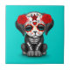 Características que deste design bonitos um filhote de cachorro preto pequeno decorou com dia dos padrões inoperantes. As rosas vermelhas aparecem nas orelhas de cães quando uma estrela de cinco pontos se sentar no meio da testa. A cara do filhote de cachorro preto é branco pintado e é decorada com redemoinhos e padrões de ponto na tradição do dia dos crânios inoperantes do açúcar. Os ossos brancos e uma caixa torácica aparecem no corpo do dog'd que lhe dá um olhar de esqueleto. O corpo principal e pequeno feito sob medida excedente junto com os detalhes na pele cria uma combinação bonita de uns desenhos animados e de um olhar realístico. Este filhote de cachorro original e adorável é um dia adorável do design inoperante.