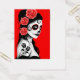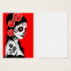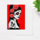 Este Dia dos Mortos inspirou uma design com uma bela mulher com padrões de crânio de açúcar no rosto. Três rosas aparecem em seu cabelo preto a jato com mais dois rosas tatuados em seu braço. A garota está de lado com a cabeça virada levemente para o espectador. Sua pele branca pura realmente se destaca contra o cabelo preto e o vestido assim como o fundo vermelho brilhante. Esta design única é uma representação impressionante deste Dia da Mulher Morta.