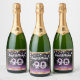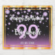 Vinho de aniversário elegante, glamouroso e feminino ou rótulo de garrafa de vinho espumante. Brilhante de cor roxa e preta com borrifador de diamante falso e uma moldura de ouro. Modelos para um nome, 90 anos e uma data. Data de nascimento ou data da festa/aniversário. Com o texto: Feliz Aniversário! Letras brancas e cor de rosa. O nome é escrito com um script de estilo manuscrito.