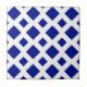 Um padrão ousado e geométrico de grandes e pequenos marinhos em um fundo branco. O branco forma uma estrutura que separa as formas de diamante azul escuro.