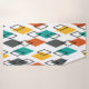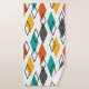 Este conjunto de toalhas tem um pano de lavagem laranja, uma toalha amarela, e uma toalha de banho com um design moderno do século médio de diamantes em laranja, amarelo, turquesa, cinzas, e esboçado espalhado por um campo de branco.