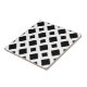 Um padrão ousado e geométrico de grandes e pequenos diamantes negros num fundo branco. O branco forma uma estrutura que separa as formas de diamante.