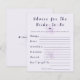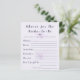 Adicione um toque significativo e memorável à sua celebração com este cartão roxo boho floral "Conselhos para a Noiva". Projetado com suaves acentos botânicos e tipografia moderna, ele convida os convidados a compartilhar conselhos, desejos e dicas de casamento para a futura noiva. Perfeito para chás de panela, este cartão elegante se torna um item de recordação que a noiva pode guardar por muito tempo após a celebração, repleto de amor, sabedoria e mensagens atenciosas de familiares e amigos.