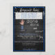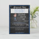 Convite de festas de Baixa de Microfone. Janto, bebidas, hotel, Rsvp. Fundo de madeira preta. Fonte azul e branca.