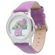 Dino the Dinosaur Cute Kid's Watch apresenta um Dino o dinossauro roxo que fica de pé em sua caverna com brilho solar. Presente perfeito para o amante dos dinossauros em sua vida. Escolha o estilo e a cor do seu relógio!