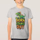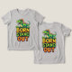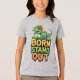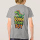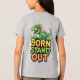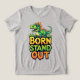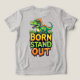 Dinossauro de desenho animado verde brincalhão empoleirado acima de letras coloridas e negrito que dizem 'Nascido para se Destacar'. Arte alegre e atraente perfeita para roupas infantis, pôsteres, adesivos, convites de festa e projetos de branding divertidos.
