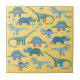 Muitos dinossauros azuis, Tyrannosaurus rex, Spinossauro, Stegossauro, Diplodocuments e Tricerátops num fundo amarelo. Perfeito para paleontólogos.