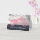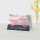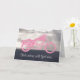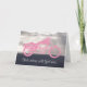 Este cartão de compaixão apresenta uma moto cor-de-rosa na silhueta contra um céu nublado com os raios solares a brilhar. Ele foi projetado para honrar a vida e confortar a família de um motociclista. A frase abaixo da motocicleta diz, Ela está cavalgando com Deus agora. A bicicleta se senta em uma superfície preta escura. Uma maneira pensativa de lembrar uma mulher que era uma motociclista cristã.