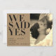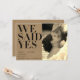 Dissemos que sim, Kraft Sepia Foto Anúncio de Casamento é uma forma excelente de deixar seus amigos e família saberem que fugiu, teve uma cerimônia secreta, ou casamento privado! A frente da placa foi projetada para exibir sua foto de orientação vertical favorita e tem um filtro de tonalidade sepia aplicado. As palavras "Nós dissemos sim" são impressas à esquerda numa tipografia de moda negra, eterno e elegante, sobre um fundo de papel kraft falso. Seus nomes, data do casamento e local aparecem no canto inferior esquerdo em uma fonte moderna, moda sans serif. A parte traseira da placa permite digitar uma saudação pessoal e também apresenta uma foto de orientação vertical/retrato em preto e kraft. Este é um design de modelo e é muito fácil de personalizar para atender às suas necessidades. Fotos e design copyright Anastasia Surridge, 2017.