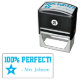 Este design de carimbo motivador apresenta a mensagem encorajadora "100% PERFECT!" e um nome de professor personalizado. Ele também apresenta uma forma decorativa de estrela. Poderia ser usado por um professor ou educador ao marcar missões, para reconhecer que o aluno fez bem.
