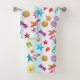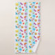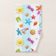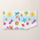 Toalha de banho divertida e colorida com padrão de verão. Listras brancas e azuis-bebê largas são o fundo para gráficos relacionados à estação de verão. Palmeiras, conchas, óculos de sol e sol trazem visões de dias quentes sob o sol, céu azul. Este design brilhante e alegre pertence a uma cabana de Verão, à casa de banho de adolescentes, ou a qualquer casa perto da costa.