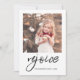 O cartão religioso de Natal simples e elegante "regozijo e alegria" apresenta um roteiro moderno de regozijo a preto num fundo branco com uma fotografia, e inclui um padrão de pontos preto e branco na parte de trás do cartão.