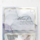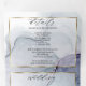 Salpico etéreo de manchas de tinta alcoólica em tons de azul oceano, verde-azulado e roxo âmbar rico - cada seção destacada com uma sobreposição emoldurada em ouro branco translúcido, na parte central frontal está sua foto acentuada com uma moldura dupla dourada e por trás da sobreposição branca translúcida para um apelo esotérico um belo design abstrato moderno para um convite de casamento completo, que inclui um cartão de resposta com escolha de refeição pré-endereçado e destacável para seus convidados enviarem facilmente de volta - um convite de casamento impressionante tudo-em-um -