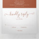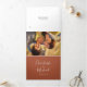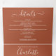 Convite de casamento terracota tri-fold completo com tipografia elegante e sua foto especial. O convite inclui detalhes de informações para os convidados da celebração e um cartão RSVP destacável. Criado por Thisisnotme©