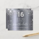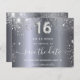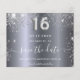 Uma garota e moda Salve o cartão de data para uma doce festa de aniversário 16, 16. Um fundo metálico moderno falho prateado. Decorado com pó de brilho falso. Personalize e adicione uma data e nome/idade. Letras coloridas de cinza. O texto: Salvar a Data é gravado com um script de estilo com letra de tendência grande. Número 16 com uma fonte no estilo do balão.
