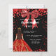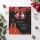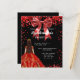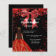 Um convite moderno, na moda e glamouroso para uma doce festa de aniversário 16, 16. Um fundo preto com brilhos, um vestido vermelho e um arco vermelho. O nome é escrito com um moderno estilo escrito à mão. Personalize e adicione os detalhes da sua festa. 1 folha = 1 convite impresso de borda a borda.