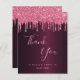 Um cartões de agradecimentos para um doce 16, 16 anos. Uma cor de fundo metálica de aparência grosseira e falsa. Com pingos cor-de-rosa, pingos de tinta pingando. À frente, um texto com letras grandes e o texto: Obrigado, seu texto, título e uma data. Back: Modelo para sua nota de agradecimento e seu nome.
