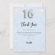 Um cartões de agradecimentos de aniversário feminino e elegante para uma festa de 16 doces. Uma cor azul-clara, azul-bebê de fundo, com brilho prateado sujo, brilha. À frente, um grande texto escrito à mão e o texto: Obrigado. Personalize e adicione sua nota de agradecimento e seu nome