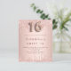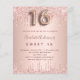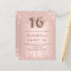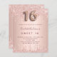 Um convite moderno, na moda e glamouroso para uma festa de aniversário Doce 16, 16. Um fundo rosa dourado com pingos, pintura pingada. O nome é escrito com um moderno e escuro, rosa dourado, escrito com letra de estilo manuscrito. Personalize e adicione os detalhes da sua festa. O número 16 é escrito com uma fonte de estilo de balão, script.