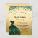 Um convite moderno, na moda e glamouroso para uma doce festa de aniversário 16, 16. Na frente: Um fundo de ouro falso com um confete verde, um vestido verde esmeralda. O nome é escrito com um moderno estilo escrito à mão. Personalize e adicione os detalhes da sua festa. 1 folha = 1 convite impresso de borda a borda.