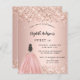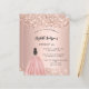Um convite moderno, na moda e glamouroso para uma doce festa de aniversário 16, 16. Um fundo rosa de ouro com poeira falsa de ouro, uma garota vestindo um vestido de bola. O nome é escrito com um moderno estilo escrito à mão. Personalize e adicione os detalhes da sua festa. 1 folha = 1 convite impresso de borda a borda.