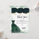 Um cartões de agradecimentos de aniversário feminino e elegante. Um fundo branco, com brilho verde, faíscas, rosas verdes e um vestido verde. À frente, um grande texto escrito à mão e o texto: Obrigado.