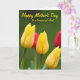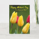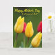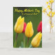 Este cartão apresenta três botões de tulipa amarelos em primeiro plano, suas pétalas fechadas com finas linhas verticais que capturam a luz como um piscar de olhos suave e afetuoso ❤️. Caules verde-escuros se erguem sob eles, ligeiramente mais escuros perto da base, dando às flores uma aparência firme e estável. Atrás das tulipas, o fundo se desvanece em um campo suave e desfocado de verde rico que parece calmo e íntimo, como um momento tranquilo no jardim compartilhado com alguém próximo. Para um lado, um toque borrado de vermelho quente sugere outra flor por perto, adicionando um contraste sutil que parece uma presença amigável 🌼. Na parte superior, a mensagem “Feliz Dia das Mães para uma Tia Querida” é colocada como uma sobreposição em uma fonte cursiva fluida. A letra é um amarelo brilhante que ecoa as tulipas, destacando-se claramente contra os verdes mais escuros. As palavras ficam centralizadas perto do topo, com as tulipas agrupadas abaixo, e um bor