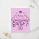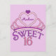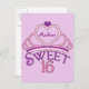 Um doce e bonito convite de dezesseis festas de aniversário personalizado com uma tiara rosa tocada com um coração roxo e o nome dentro de sua adolescente. Palavras Doce Dezesseis escritas em belo roteiro para o seu adolescente. Personalize a parte de trás do convite com os detalhes do grande bash, incluindo tempo, data, local e RSVP.