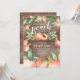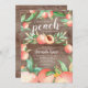 Pessegueiro doce está no caminho do convite para chá de fraldas com uma moldura de pessegueira e folha verde em um fundo de madeira rústica. Visite nosso compro para ver nossa doce coleção de design de pêssego.